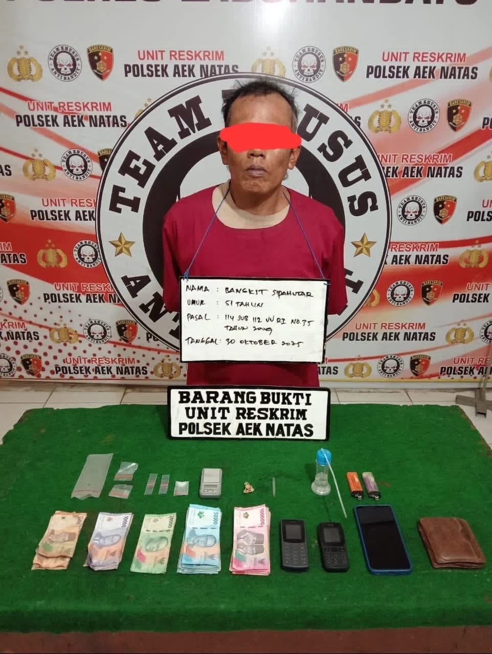 Satreskrim Polsek Aek Natas Polres Kabupaten Labuhanbatu kembali menunjukkan komitmennya dalam pemberantasan Narkotika. Dan, upaya pemberantasan peredaran narkotika di wilayah hukum Polres Labuhanbatu i membuahkan hasil. Satuan Reserse Kriminal Polsek Aek Natas berhasil mengamankan seorang pria berinisial BS (51), warga Dusun II Unte Mungkur, Desa Sibito, Kecamatan Aek Natas, Kabupaten Labuhanbatu Utara, yang diduga sebagai pengedar narkotika jenis sabu.