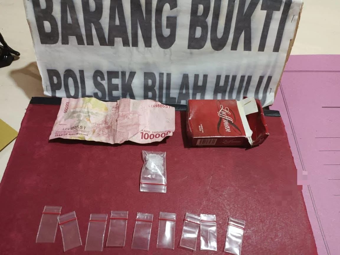 Tersangka insial RDT, diamankan petugas Polsek Bilah Hulu di Jalan Lintas Dusun Sumber Sari Desa Perbaungan, Kecamatan Bilah Hulu Kabupaten Labuhanbatu, Kamis (30/10/2025) sekira pukul 21.00 wib. Adapun barang bukti yang disita dari tersangka yaituz 1 bungkus plastik klip transparan ukuran sedang diduga berisi narkotika jenis sabu seberat 1,32 gram, 9 bungkus plastik klip transparan ukuran kecil kosong, Kotak Rokok Lukman dan Uang tunai sebesar Rp100.000.