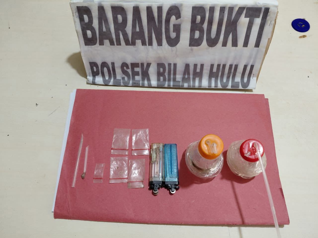 Dalam giat tersebut, petugas berhasil menemukan sejumlah barang bukti berupa alat hisap sabu (bong), pipet kaca berisi sisa narkotika, plastik klip kosong, dan korek api gas yang diduga digunakan untuk pesta narkoba. Meski tidak ditemukan tersangka di lokasi saat penggerebekan, namun polisi telah mengantongi identitas beberapa orang yang diduga sebagai pelaku dan kini dalam proses pengejaran.